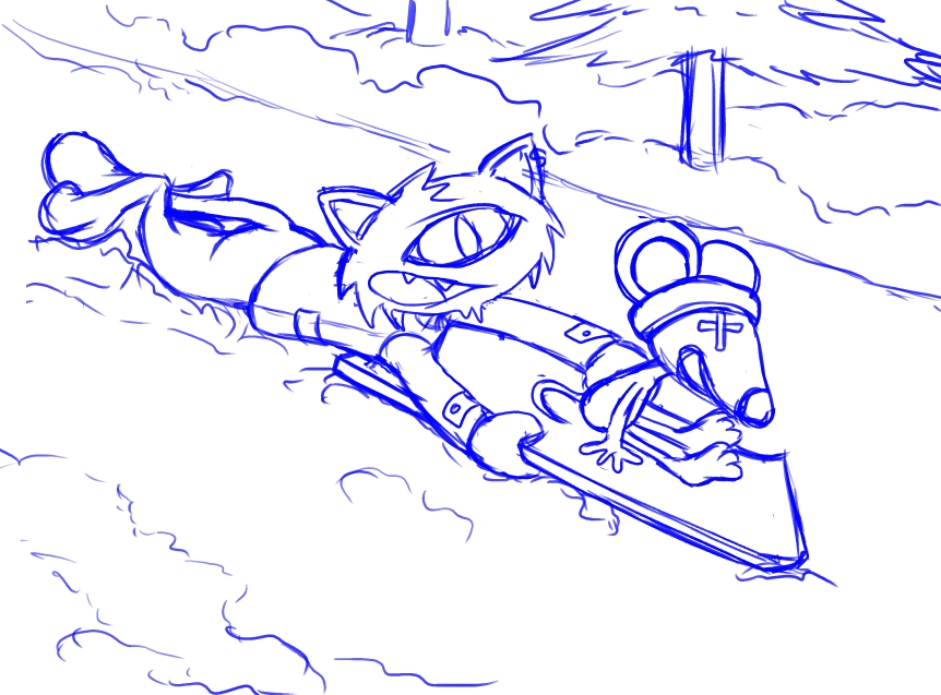 Sam and Ficus are sliding down a hill. Half way down, Sam gets slung off of it while Ficus was still on it.