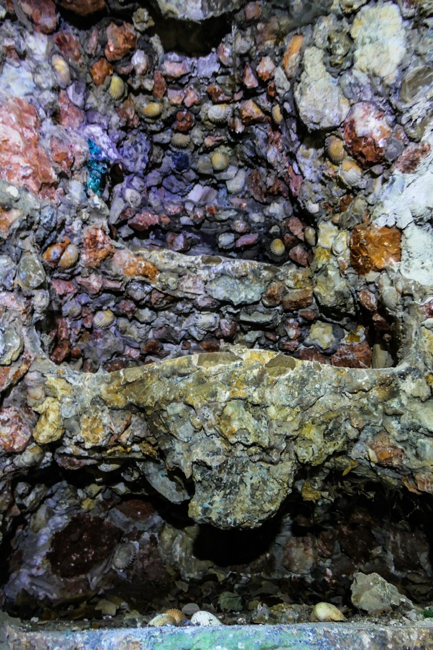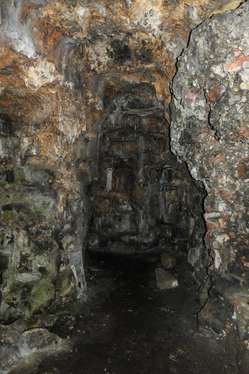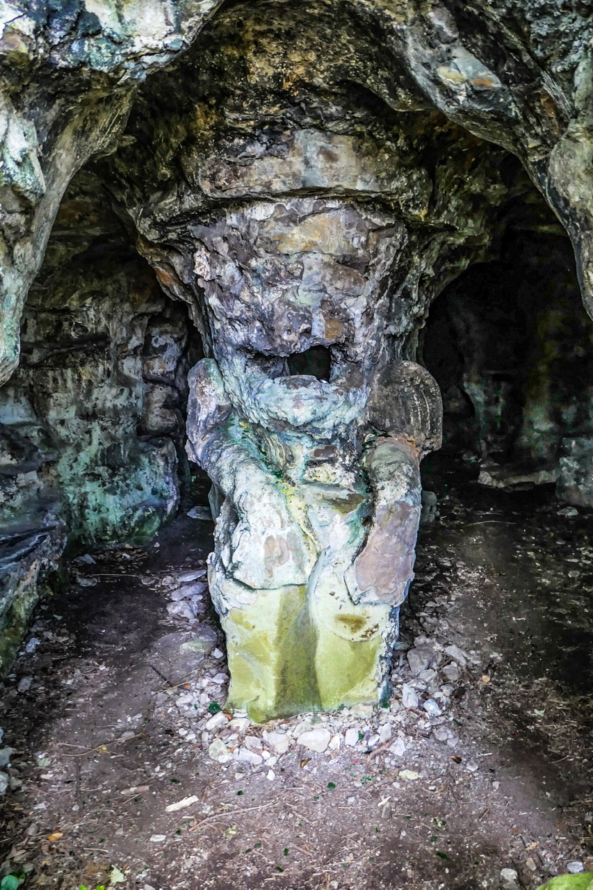 Built partly into the natural rock, and partly using rubble and mortar to create a rock-cut appearance. The grotto has 3 well-hewn entrances, while its interior has a central chamber open to the sky, and passages with niches, carved seats and a number of carved grotesque figures in the walls. The chief of these is inside the lower entrance, and comprises a heraldic lion (representing the Mostyn family) with its mouth open, and openings at its back for lighting fires that would send flames and smoke from the lion's mouth.<
