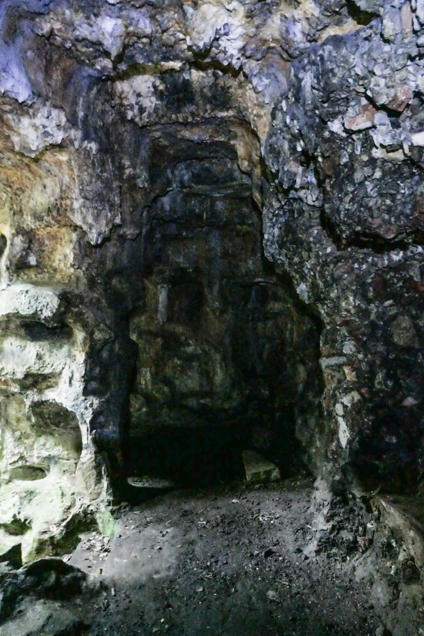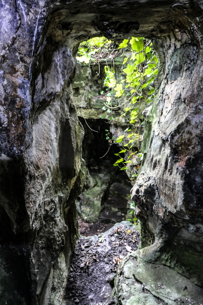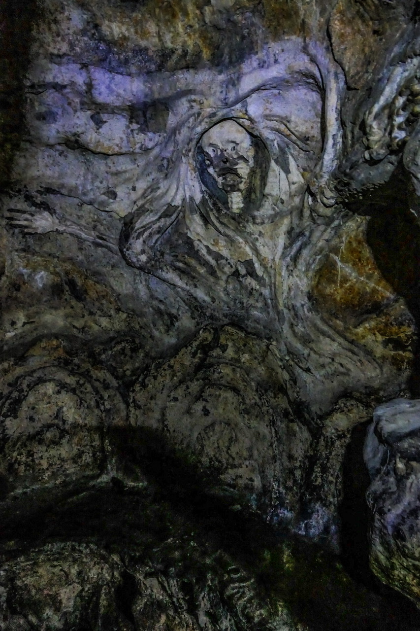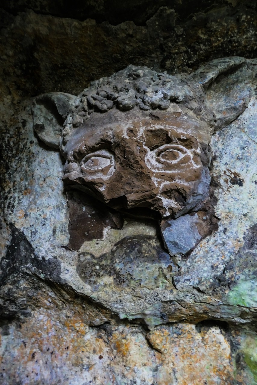 Built partly into the natural rock, and partly using rubble and mortar to create a rock-cut appearance. The grotto has 3 well-hewn entrances, while its interior has a central chamber open to the sky, and passages with niches, carved seats and a number of carved grotesque figures in the walls. The chief of these is inside the lower entrance, and comprises a heraldic lion (representing the Mostyn family) with its mouth open, and openings at its back for lighting fires that would send flames and smoke from the lion's mouth.<