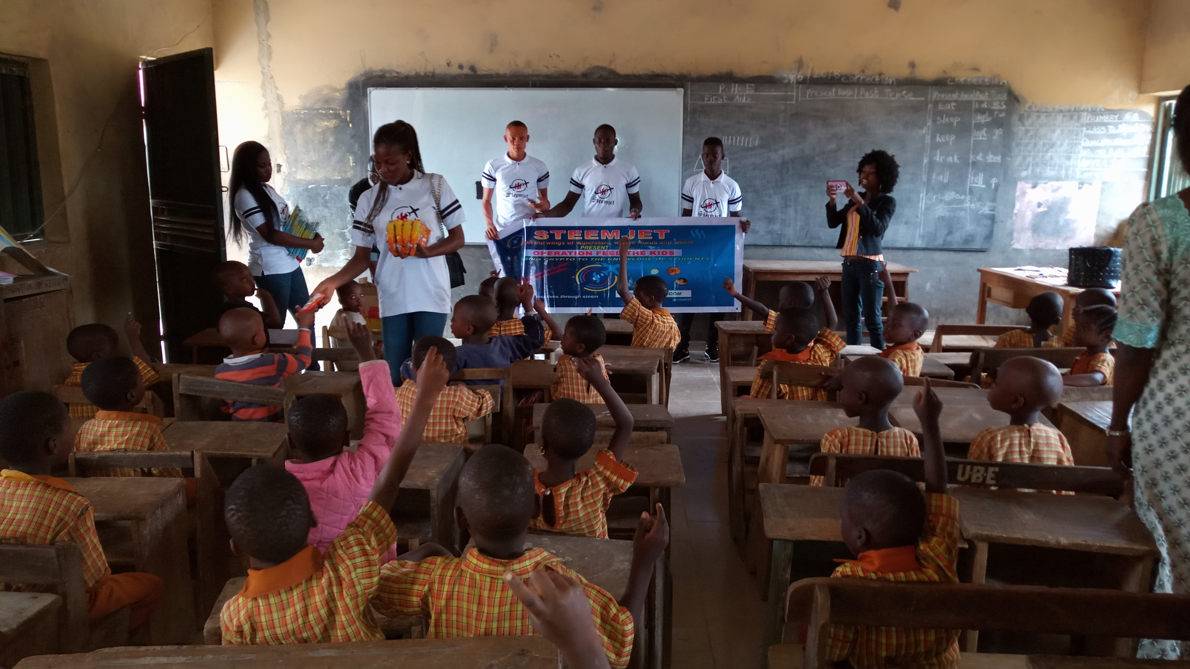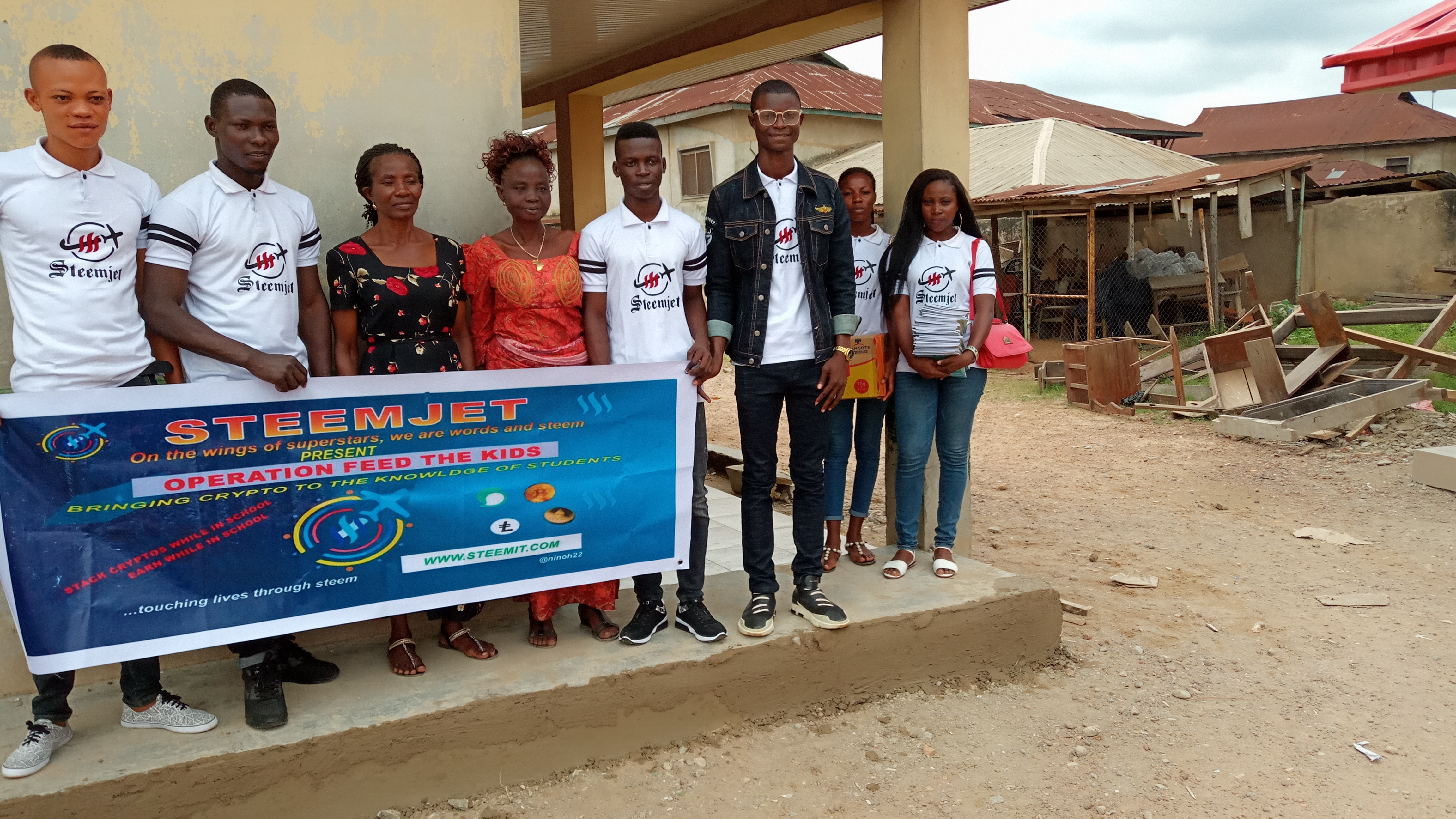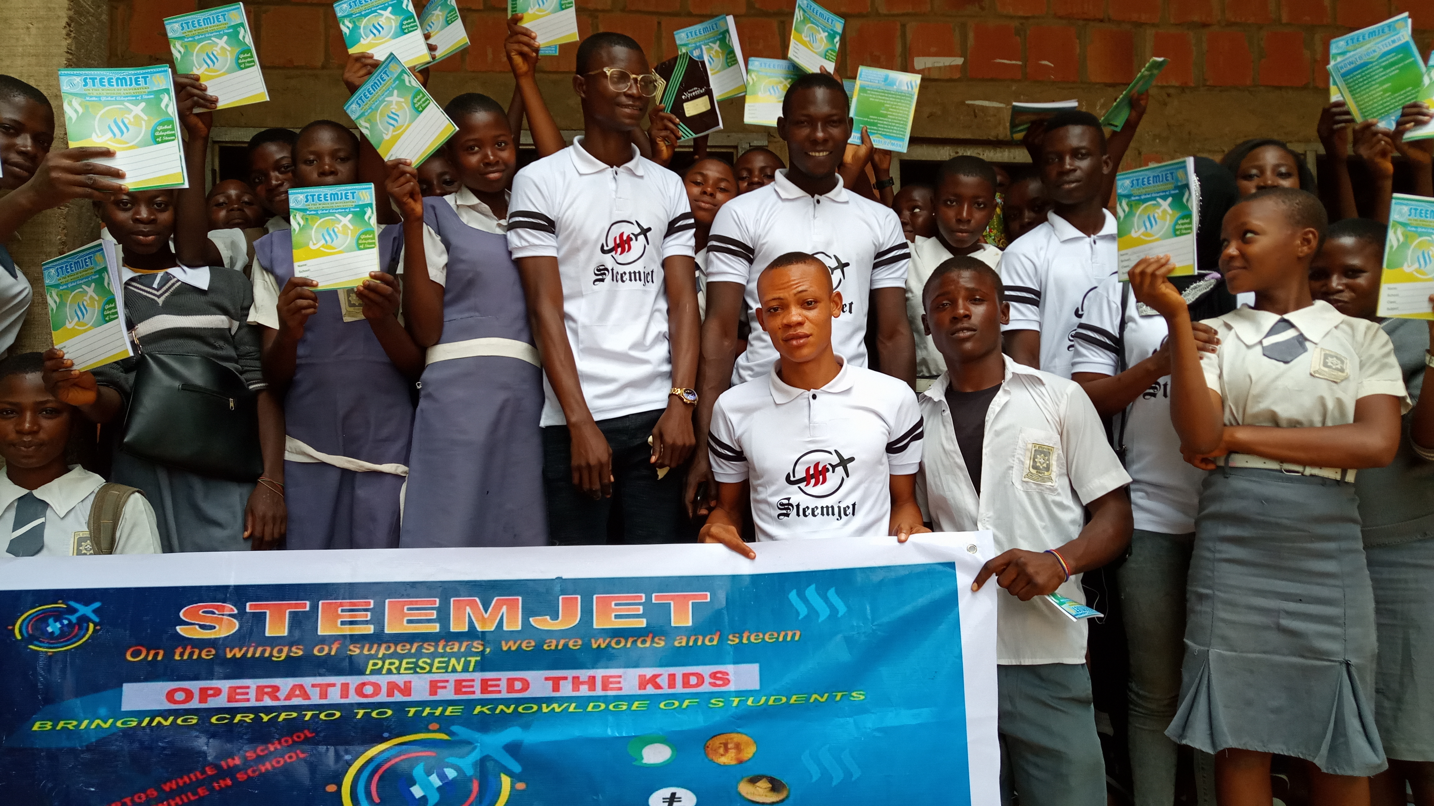 I introduce to you SteemJet Operation feed the kids , we are team of 10 delegates of the SteemJet Spaceforce members from different states in Nigeria (background), and we stormed 1 primary school and 1 secondary school in western part of Nigeria with the message of steem, creating awareness while teaching the benefits of steem and crypto(olivia and the superstar)