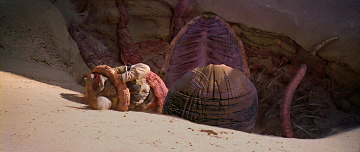 Sarlaccs are deeply unsettling. Taking approximately 30,000 years to reach maturity, they are neither plant nor animal. In-universe xenobiologists are consistently stumped by this creature that reproduces by spewing spores into the upper atmosphere that can withstand the vacuum of space. About the height of the Great Pyramid of Giza, sarlaccs house multiple stomachs to imprison future food while they slowly digest older prey. All that scar tissue on Boba Fett’s body? The corroded nature of his armor when in Cobb’s possession? All due to the sarlacc. In fact, the beskar armor is probably what kept Fett alive long enough to be rescued. It also gives Lucasfilm a handy excuse for why Temuera Morrison looks older than Boba should at this point in the timeline, since he was not created with the clones’ accelerated aging feature. But wait, it gets creepier.