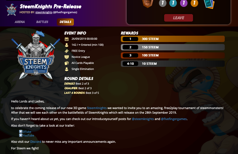 It has been a while since I have posted something on my blog and that mainly has to do with having a super busy summer and most of 'free' time going towards a little game called Steemmonsters. I am still really much in love with this game, because it challenges my brain every day to come up the right teams and besides that it also challenges me to think about making the right moves investment-wise, which cards to buy, sell, burn, rent, etc. Sometimes it feels like an extra full (be a fun) time job and that is not always easy with a 'real' full time job running my hostel on the road and raising two kids in the mean time. Hmm, it seems I am getting a bit beside the point of my post, so I'll get back on track. This post was supposed about Steemknights.