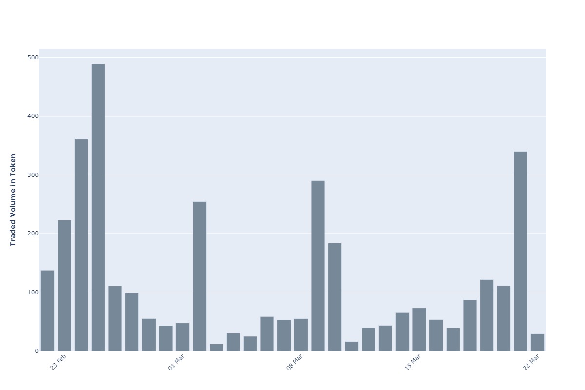 For the chart below, I did issue data from Feb 22th 2020 until Mar 22th 2020 at 12 PM/noon. At this time of yesterday, this token had an opening price of 0.38199, with a day-high of 0.382 and a day-low of 0.220. The closing price was at 0.350.