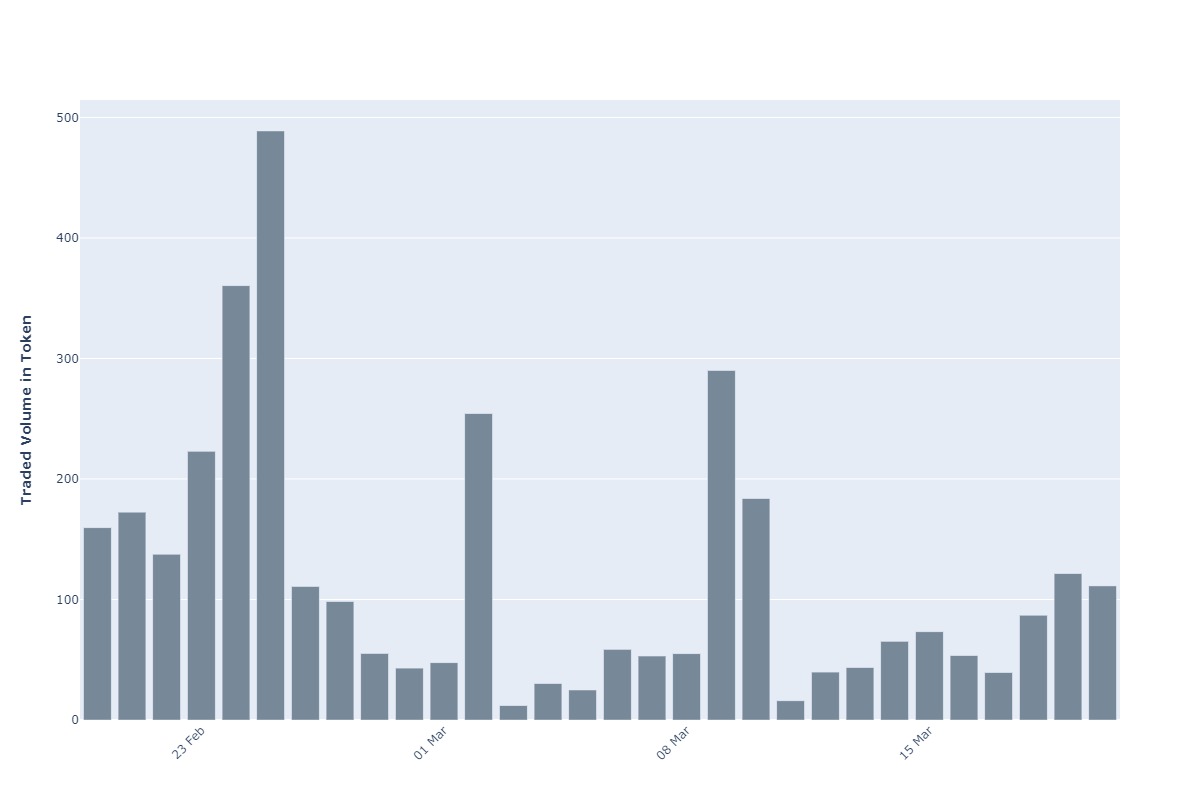 The following chart will show you the volume of token been traded for the same time frame.
