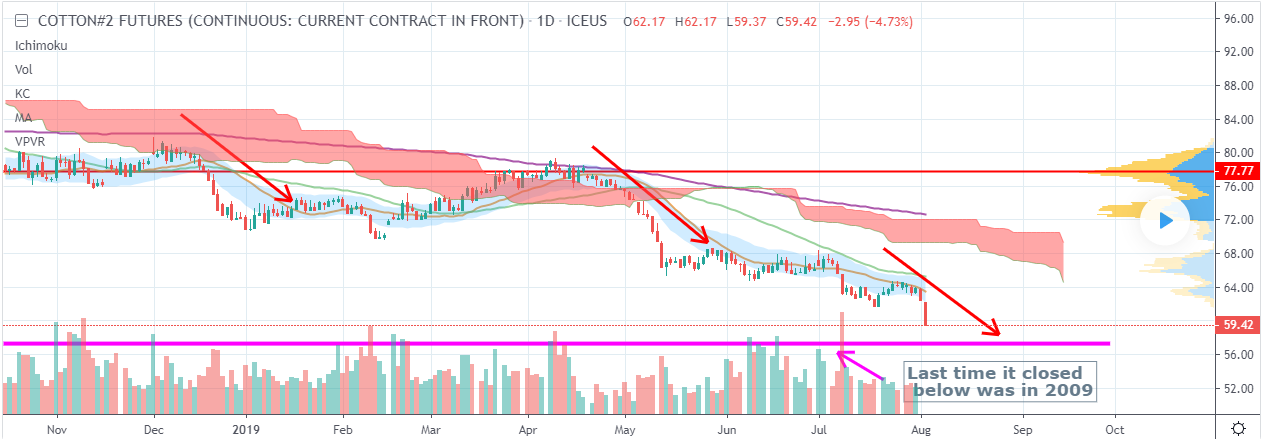 I expected Cotton to change the direction last week, but this did not happen. There was another impulsive move downside. I guess bulls are waiting for stronger support to pump their money into this market. $57 is a price, where we made a double bottom in 2009 and have never seen the level again since then. It is possible to get through, but it is very unlikely there will not be any reaction. It will be either reversal or an area of the next bulls stand.