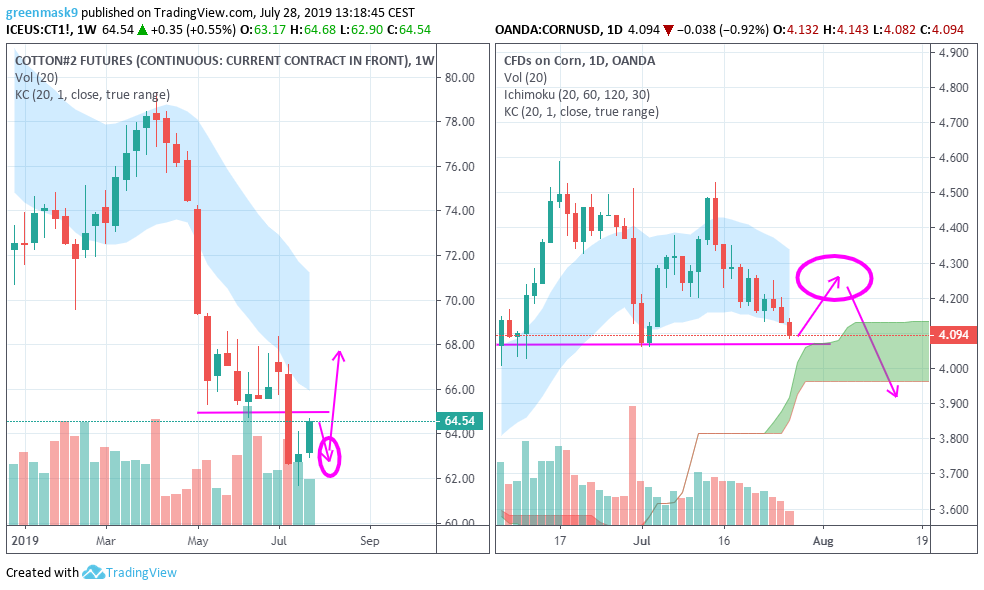 Both markets are closing on their key structures. I want to see them bounce and create a higher low in case of cotton and lower high in case of corn. If success, I will be looking for an entry point within or around the circles. As they bounce, I want to see candles decreasing over the duration of bounce. Perhaps, some rejection candles (long tail for cotton, long wick for corn). Then, I will open my position on one of these.