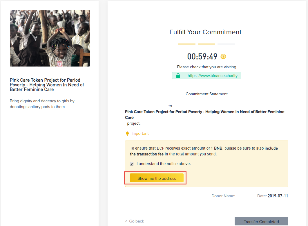 下一步,會給你捐款的Address。此時畫面先不要離開。待你將你的捐款匯到此Address後,再按完成。