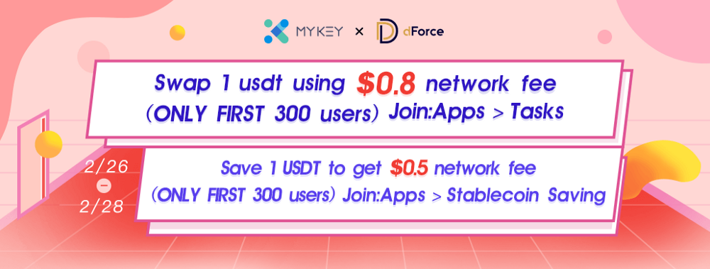 Since Ethereum version was launched, MYKEY has been committed to letting more users understand DeFi and experience decentralized financial management. This time, MYKEY and dForce present a time-limited activity. Users can swap 1 USDT using $0.8 network fee and save at least 1 USDT to get $ 0.5 network fee!