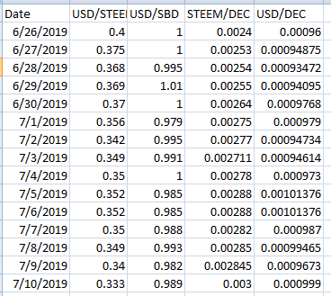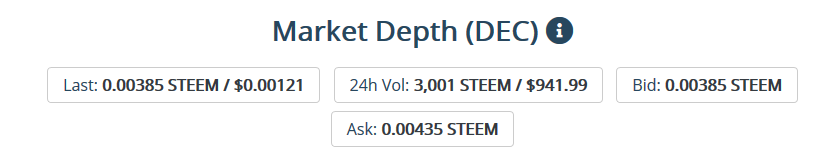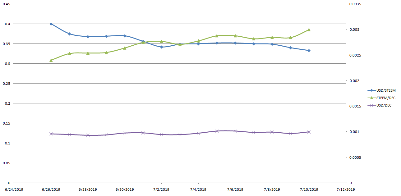 As STEEM has been dropping in USD terms, DEC has been rising. And it has almost perfectly offset each other. DEC has been hovering right around 0.001 USD per DEC. The low has been 0.00093472 and the high has been 0.00101376. That's a really tight range and shows some great support among DEC buyers.