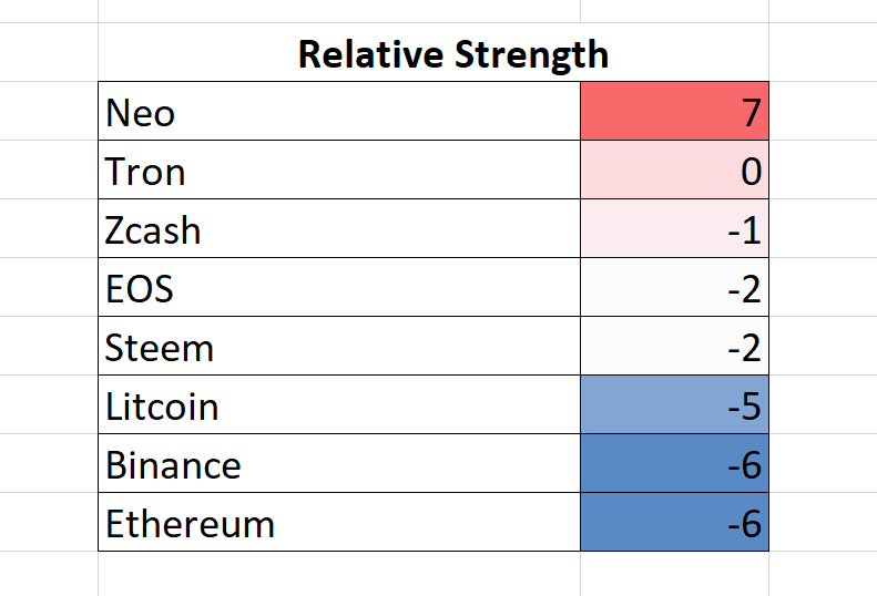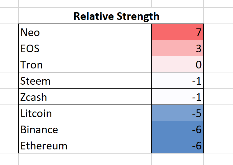 the altcoins relative strength, relative to Bitcoin are the following: