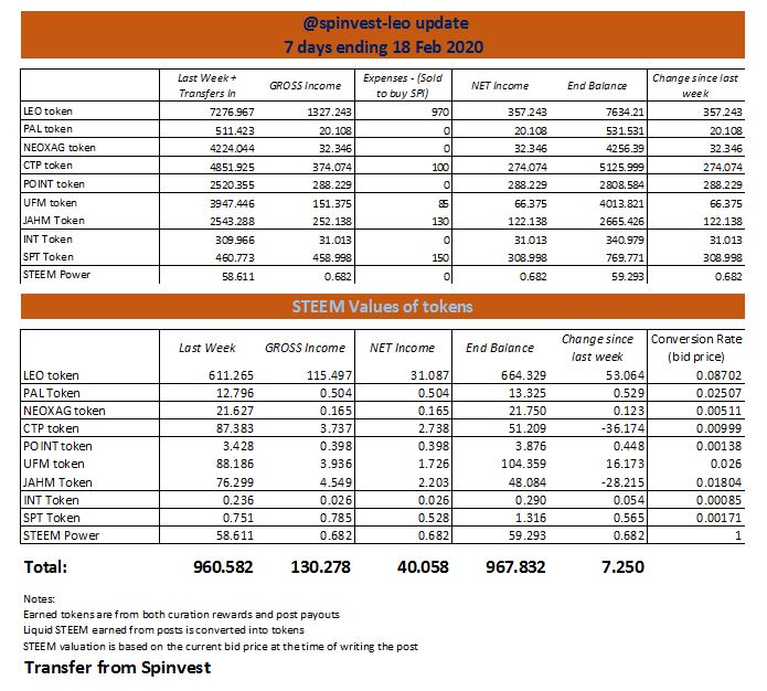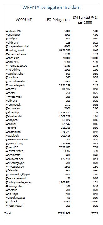 If you have not heard of @spinvest-leo before, what we do is accept delegations of LEO power, and pay a weekly passive return with SPI (spinvest) tokens. The return is calculated on 1 SPI per 1000 LEO delegated per week (adjusted from today) Any amount over 10 LEO can be delegated, for a weekly payout. The asset base we are building here from surplus earnings above the mining payouts are added to the Spinvest asset base, increasing the value of the tokens you earn. We have branched out our voting and are earning curation income across a growing list of tribes.
