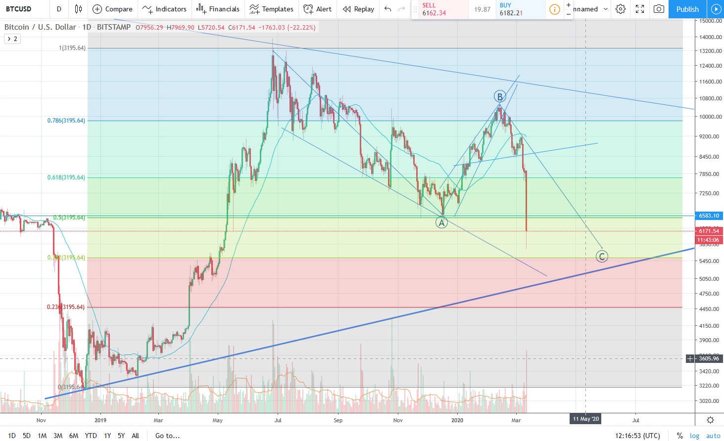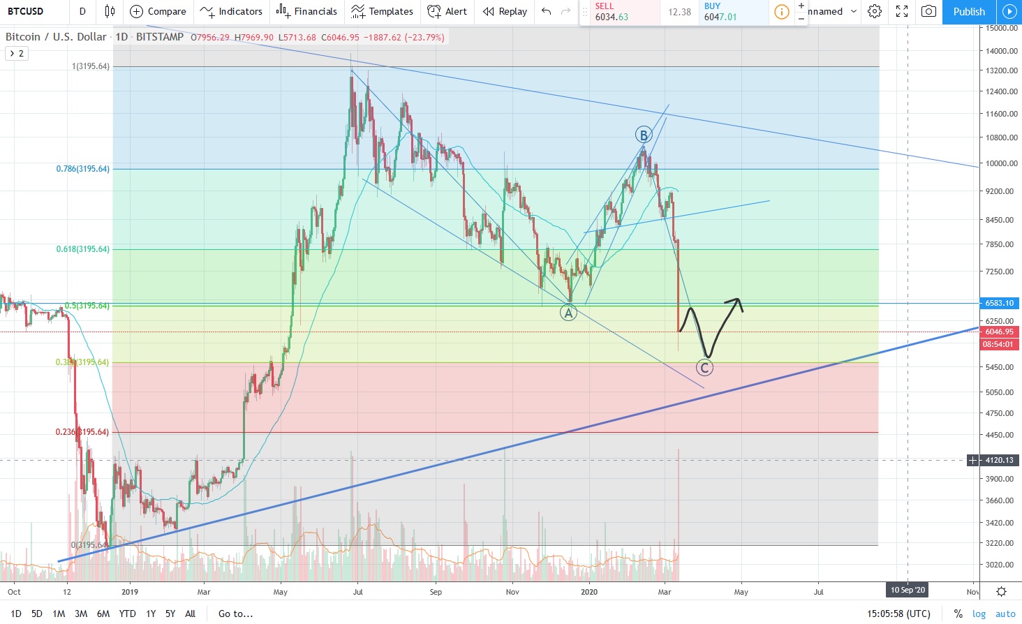 You can see that we have expected this correction for quite some time indicated with (C) in the chart. I only thought that it would come more slowly. However, the trough was at 5.700$ (I think it still might fall a bit lower). This corresponds with our predictions.