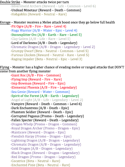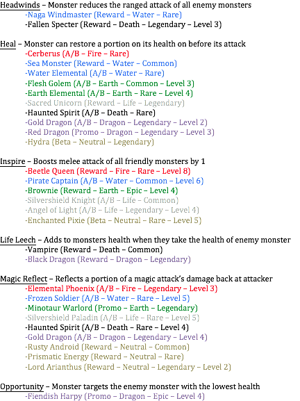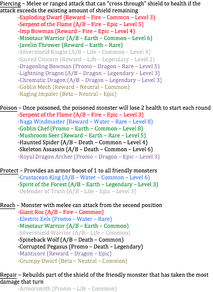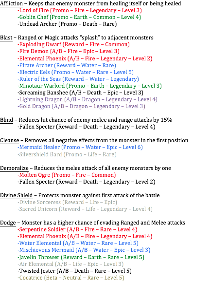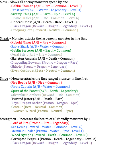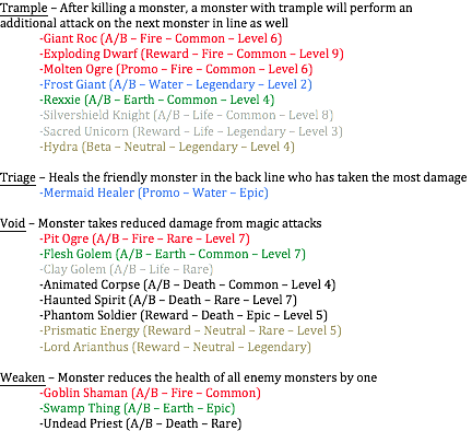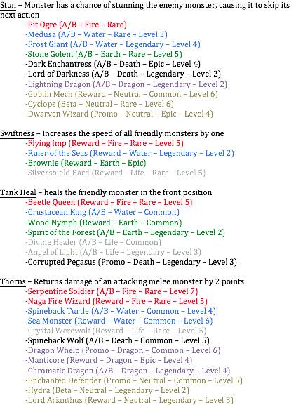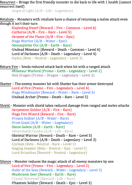 Steem Monsters sorted by abilityadamsteele (25)in #steemmonsters • 6 years ago This is my first post to steempeak. I hope it's useful to see which splinters have the various abilities and at which levels. Happy battling! #splinterlands #crypto #steem #monster