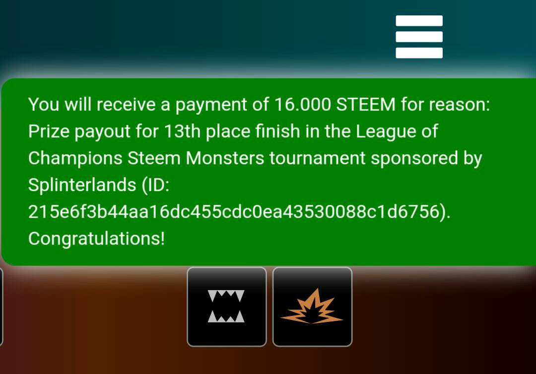 I have been making significant progress in steemmonsters and finally got to win a 16 Steem prize for getting the 13th position in the League of Champions Steem monsters competition.