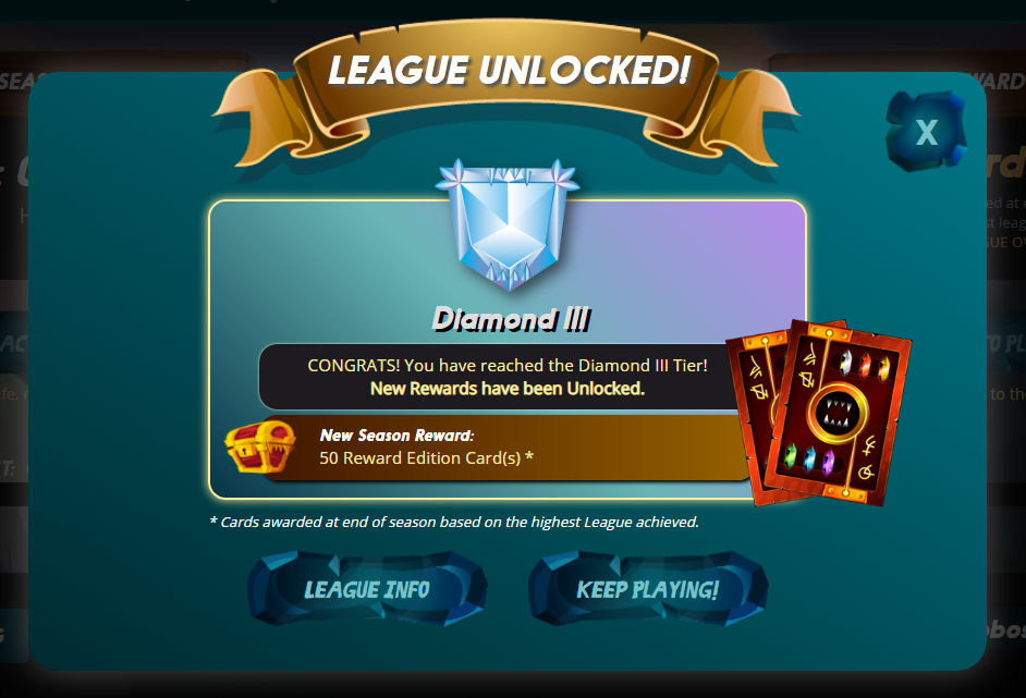 Hola comunidad de Steem! Hoy les quería compartir otro objetivo cumplido de los que me he propuesto en Steem Monster. El día de ayer pude clasificar en la liga de "Diamante III".