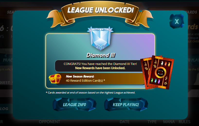 I ranked up in my league. The highest I made it last season was Gold 1. Now I am in Diamond 3. I will get 40 reward cards regardless of weather I rank up anymore or not. I have spent a lot of time improving my deck and understanding the best way to play different scenarios. I plan to make a few posts in the future on how to improve your game play. There is much more to SteemMonsters than just jamming a bunch of cards onto screen and hoping they win.