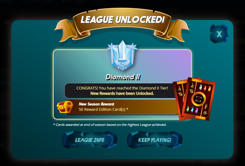 Steemmonsters Diamond 2 Leagueelg (31)in #steemmonsters • 7 years ago I briefly achieved the Diamond 2 League rank. But, I lost a few matches afterwards. I hopefully will reach it again before the daily quest reloads. #league #steemonster #cards
