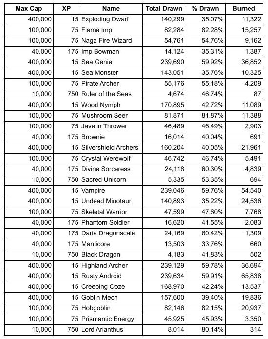 Notable remaining cards include Flame Imp at 82.2% draw, Mushroom Seer at 81.8%, Hobgoblin at 82.1%, and Lord Arianthus at 80.1%. Burning stats for some of these higher priced legendary cards is also really interesting. Based on some rough calculations, I assume the cards above 80% drawn will run out in around 75+ days, but that could be quicker if more players join. Also, does anyone know if gold cards count towards the reward card limit or are they a separate category? Let me know if any typos or calculation error jump out! Hope this helps everyone!