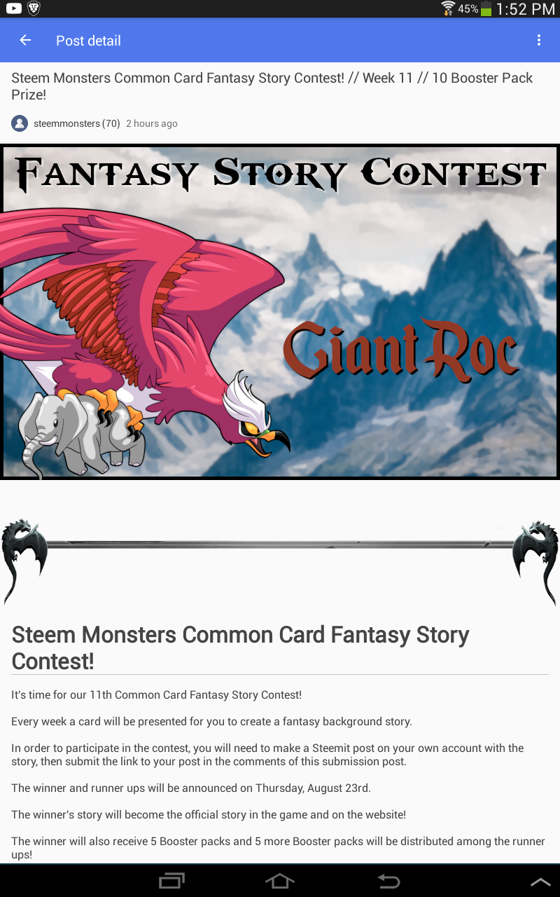 https://steemit.com/steemmonsters/@giant-roc/wednesday-august-22nd-2018-700-pm-cst--deadline--to-submit-steem-monsters-common-card-fantasy-story-contest-for-giant-rocw5ly7n1c