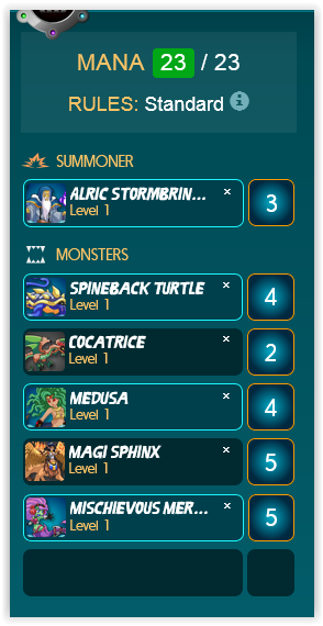 Now the Spineback Turtle as (first) tank. The Cocatrice as a filler, as I had 2 Mana left (and such a protector for the other cards), also may evade with Flying. Medusa as a second tank (but more importantly as a third magic attacker from the start like before). The stronger Mischievous Mermaid at the last position because of the few attacks which attack the last position and she might have a chance to survive one more round (and or attack before getting killed because of tempo 4 instead of 3 of the Magi Sphinx).