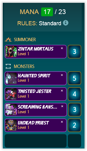 Zintar Mortalis makes a strong build at level 1 possible. Together with the Undead Priest with the ability weaken it reduces enemies Melees -2 and their health -1. Position the Undead Priest so that he is protected (middle or last position). Against Malric Inferno this often is a win and also other decks often use Melee, so when the enemies cards Melee attack goes to zero this is very strong.