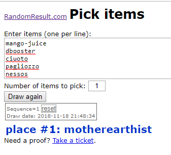 Per scegliere il risultato ho utilizzato il sito Randomresult, e il vincitore è: