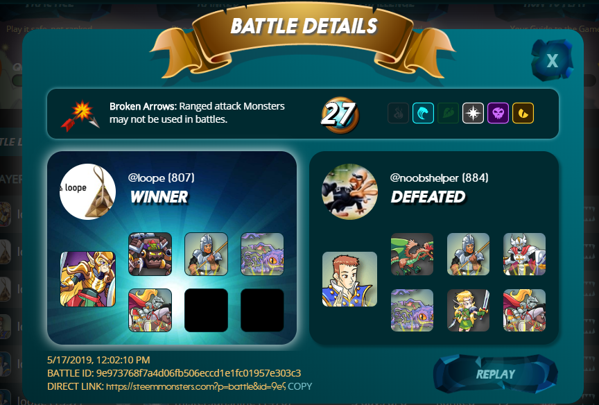 Replay >https://steemmonsters.com?p=battle&id=9e973768f7a4d06fb506eccd1e1fc01957e303c3&ref=loope