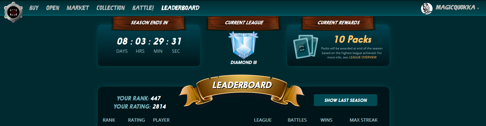First of all, I really think the steemmonsters-team did a great job on analysing the progress of season 1 for further improvement. The introduction of "League-Cardlevel-Cap-Thingies" in order to prevent low level Players from rushing the leaderboard in no time due to their high level cards is significant. The actual limits could be pushed even further in my point of view, since it is really not that tough passing one league after another if you know the basic game mechanics.