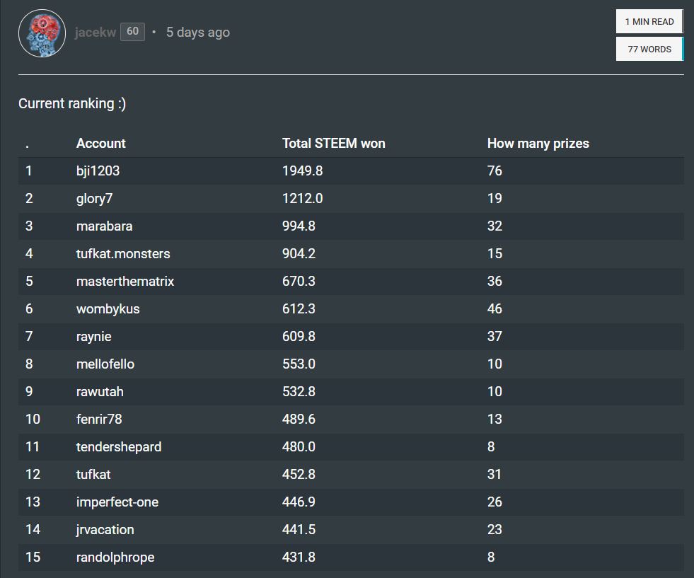 I am no where near the top 15 put pulled in a little over 100 Steem so far. Looks like I need to up my game !