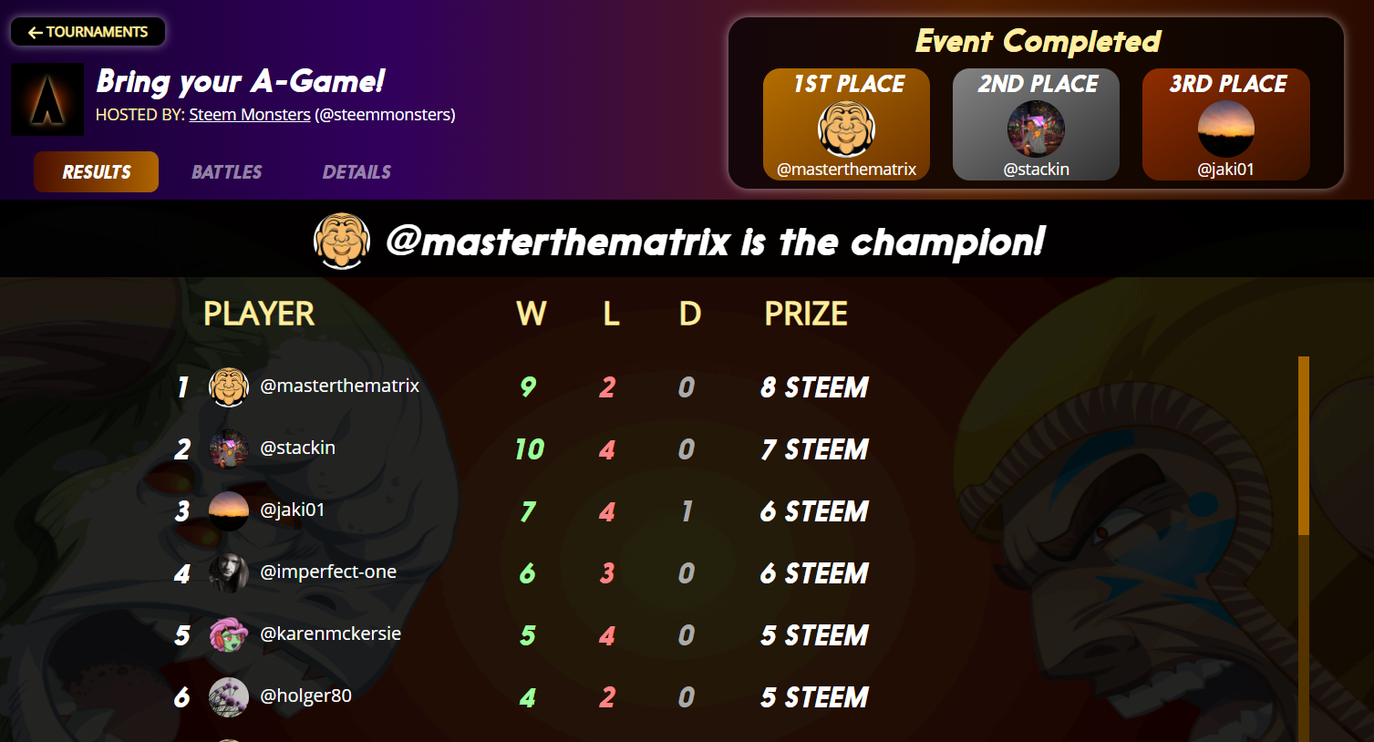 I would like to share with you my excitement about my 1st. Place at the " Bring your "A-Game" Steem Monster Tournament - sponsored by @steemmonsters
