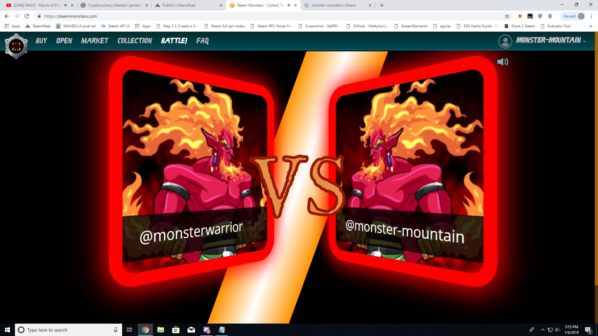 STEEM MONSTERS - FIRST GAMESmonster-mountain (53)in #steemmonsters • 7 years ago The climb begins! So far the matches have been tough with only a starter deck to my name. I did get one of the new reward cards in my daily. I hope it means good fortune is coming my way :) #coffee #contest #hopium