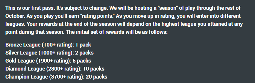 I think someone right now could build a team for under $100 and make it to 1900 and earn those 5 packs. And the thing is 5 packs isn't a ton but you got paid to play a game... AND that $100 team is still worth $100 ... maybe more.