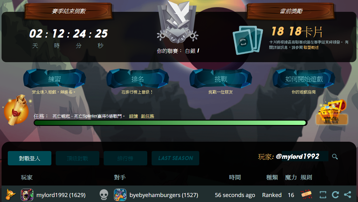 今天仍然是死亡系任務,還行、還算好打,不過能量剩下60%,雖然勝率高,但仍然賺沒多少DEC,今天順利回歸銀1,這一期季賽剩下兩天半時間,還是得加緊腳步爬上去金三....