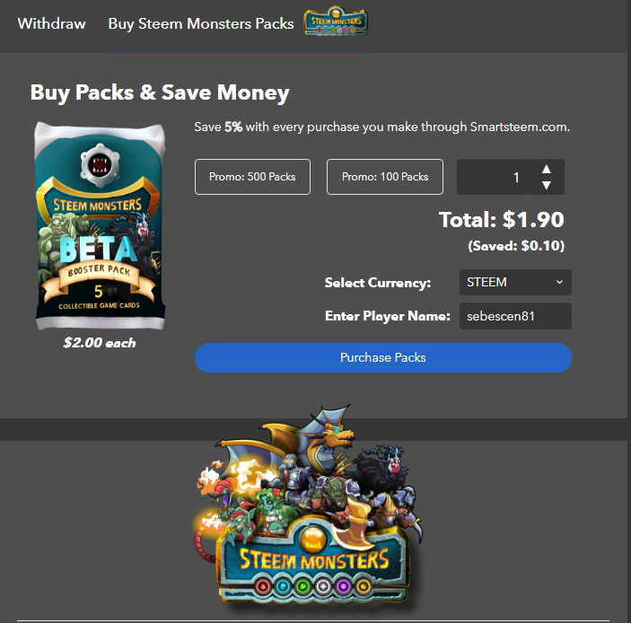 Kauf von Steemmonster Karten über Smartsteem - 0,10 $ günstiger