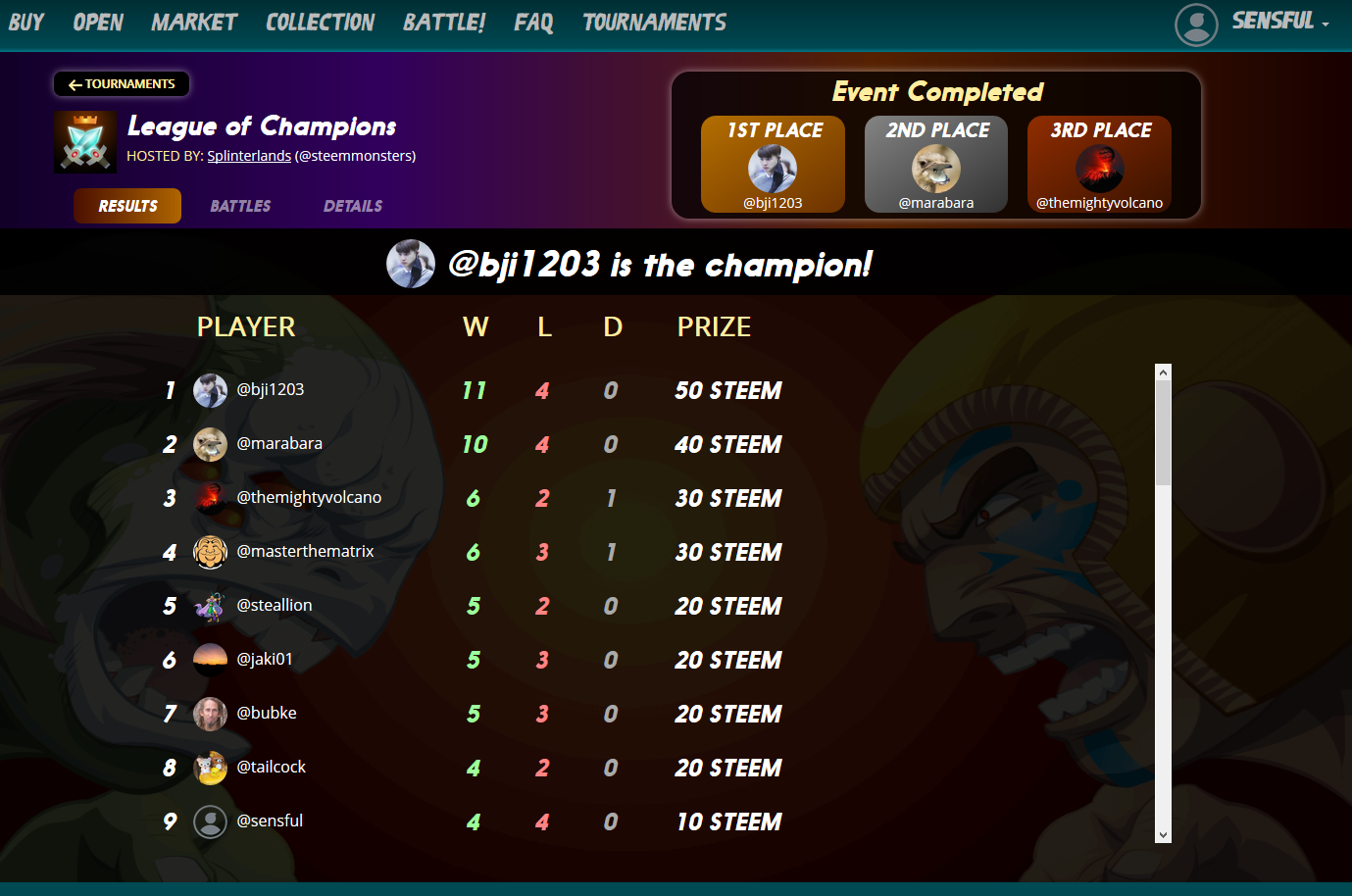 10 스팀 획득sensful (58)in #steemmonsters • 7 years ago 리그 오브 챔피언즈 토너먼트에서 9위를 하여 10스팀을 획득 했습니다. 스팀몬스터즈 토너먼트의 장점은 3등안에 들지 않아도 상금을 나눠준다는게 큰 장점인 것 같네요. 어떤 카드를 업그레이드 할지 고민 해봐야겠습니다. #kr-steemmonsters #jjm
