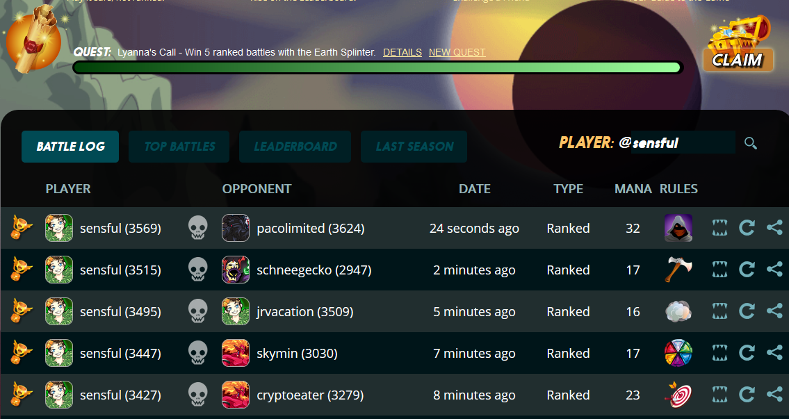 오랜만에 5연승입니다sensful (58)in #steemmonsters • 7 years ago 다이아리그 이상으로 온 이후에는 연승을 거의 못해봤는데 5연승으로 퀘스트를 깨버렸네요 대박입니다 1승마다 주는 게임머니도 생겼습니다 흥미진진합니다 #kr-steemmonsters #jjm