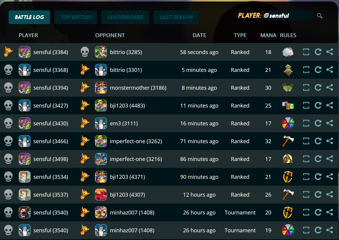 거듭되는 연패중 간신히 1승 성공..sensful (58)in #steemmonsters • 7 years ago 다이아리그 정말 빡세네요 퀘스트는 커녕 1승도 힘듭니다 저번시즌 챔피언리그까지 갔는데 아직 리그초반이라 그런듯합니다 용족으로는 할만하다고 생각했는데 용족으로도 계속 패배.. 카드 업글을 더 해야할것 같네요 #kr-steemmonsters #jjm