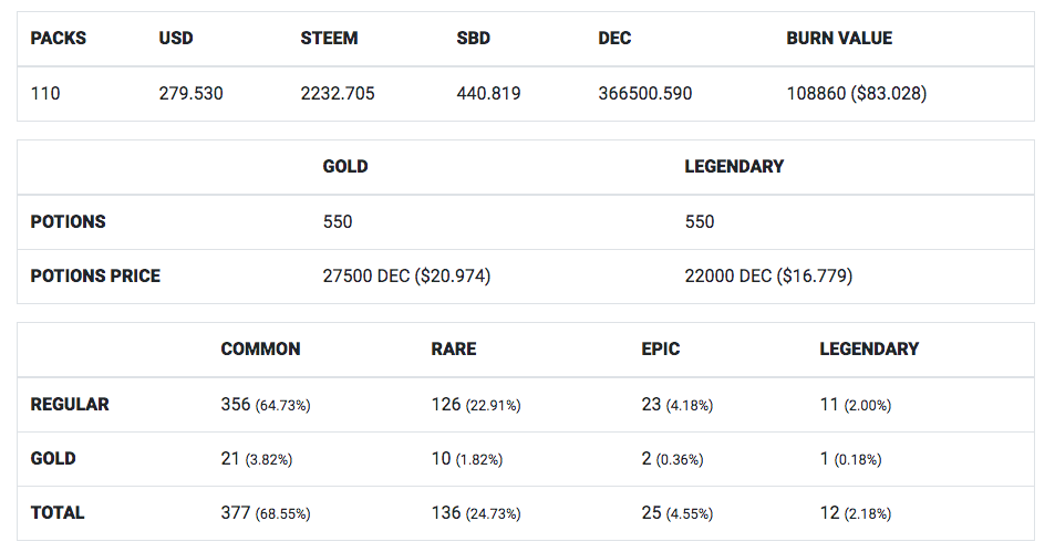 | # of Packs | Purchase Price | Affiliate rebate | MonsterMarket Rebate | Legendary Portion | Alchemy Portion | Pack Cost | Total Cost in USD (estimated at 0.00088 per DEC) |