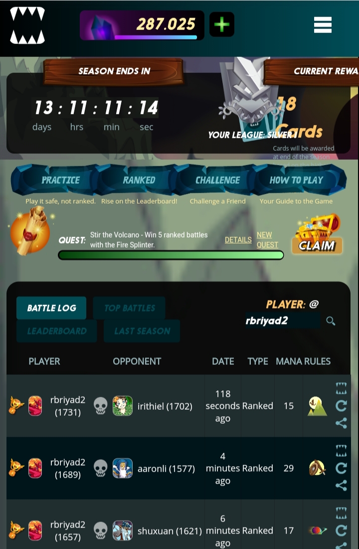 If you have not played this game yet, please make an account splinterlands of my referral link here https://steemmonsters.com?ref=rbriyad2