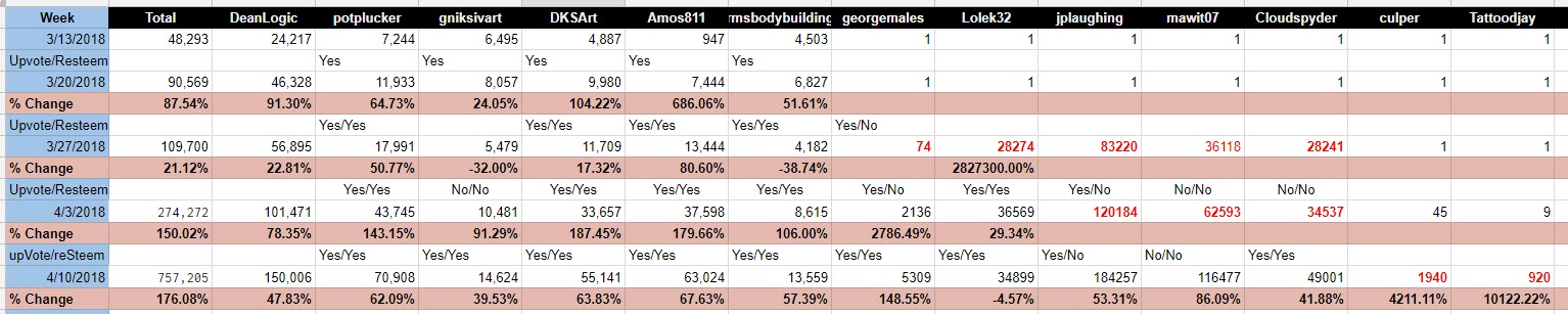Of course, the bigger you get, the hard it is to increase your percentage improvement. However, I will point out that @mawit07 did increase by the 2nd largest amount with a 86.09% increase. Unfortunately, not everyone had good news, as it seems that @Lolek32 points score dropped from last week, due to being attacked. Now, you think that @georgemales would have learned his lesson last week about reSteeming the payout article, but, apparently not. And since @mawit07 neither upvote or reSteemed the post, it means I have to go to the #3 best player of the week. And that was close, because we had 3 players in the 60+% increase levels.