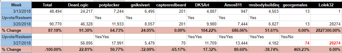- Player with the highest percentage point increase from the previous week, wins 1 SBD or 100% of the article payout if less than 1 SBD.