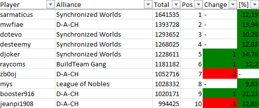 W tym tygodniu urlopowany @zb0oj nadal obsuwa się w zestawieniu na czym skorzystali - awansując o jedno miejsce - gracze: @djoker i @raycoms. Gracze z pozycji 9 i 10 zamienili się miejscami.