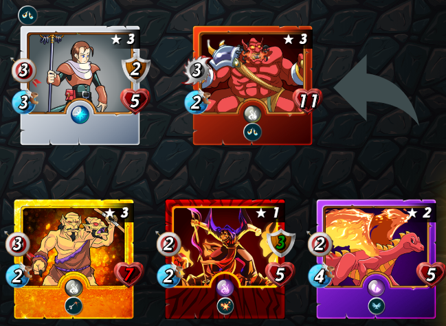 This is my standard combo for hight mana cap game with the fire element. Puting the Ogre in second line allows to distrube the enemy attach as long as possible, and still have a decent tanks once the Goblin fall.