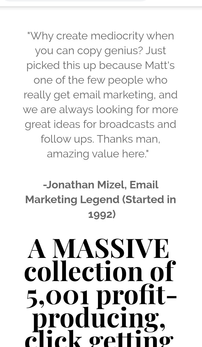 Matt bcak says I've been modeling your emails for years and adapting them. At least the ones I could find. I'm so excited to be able to finally get my hands on your swipe file because I know they make sales in any niche with a just afew little tweeks. Now, I can model 5001 of them and use them. I worked it out and its 13.7 years of money making emails. I can't wait to get my hands on this. I'm glad you put them all together in text files with the subject lines so I can quickly search for something to modify and mail. This is going to explode the new decade and 2020 for me! I really love this."