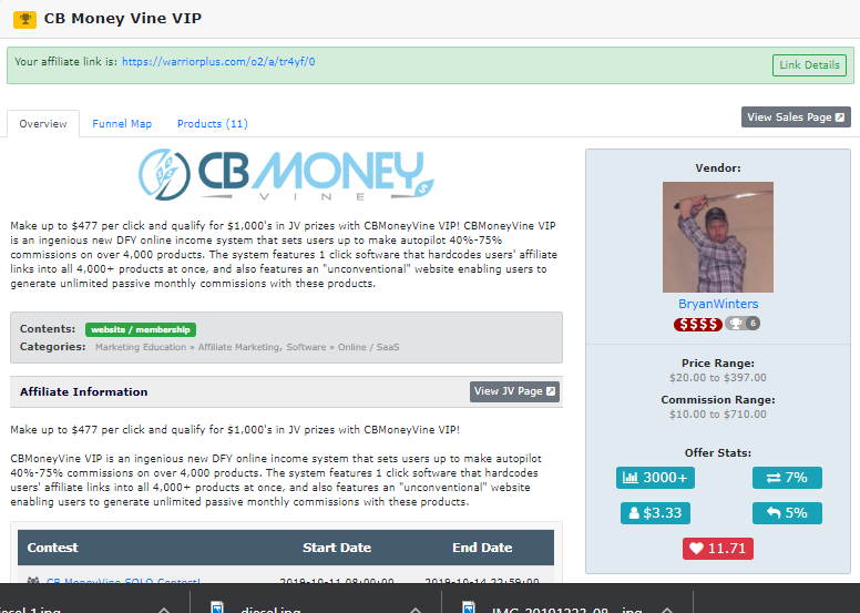 Make up to $477 per click and qualify for $1,000's in JV prizes with CBMoneyVine VIP! CBMoneyVine VIP is an ingenious new DFY online income system that sets users up to make autopilot 40%-75% commissions on over 4,000 products. The system features 1 click software that hardcodes users' affiliate links into all 4,000+ products at once, and also features an "unconventional" website enabling users to generate unlimited passive monthly commissions with these products.