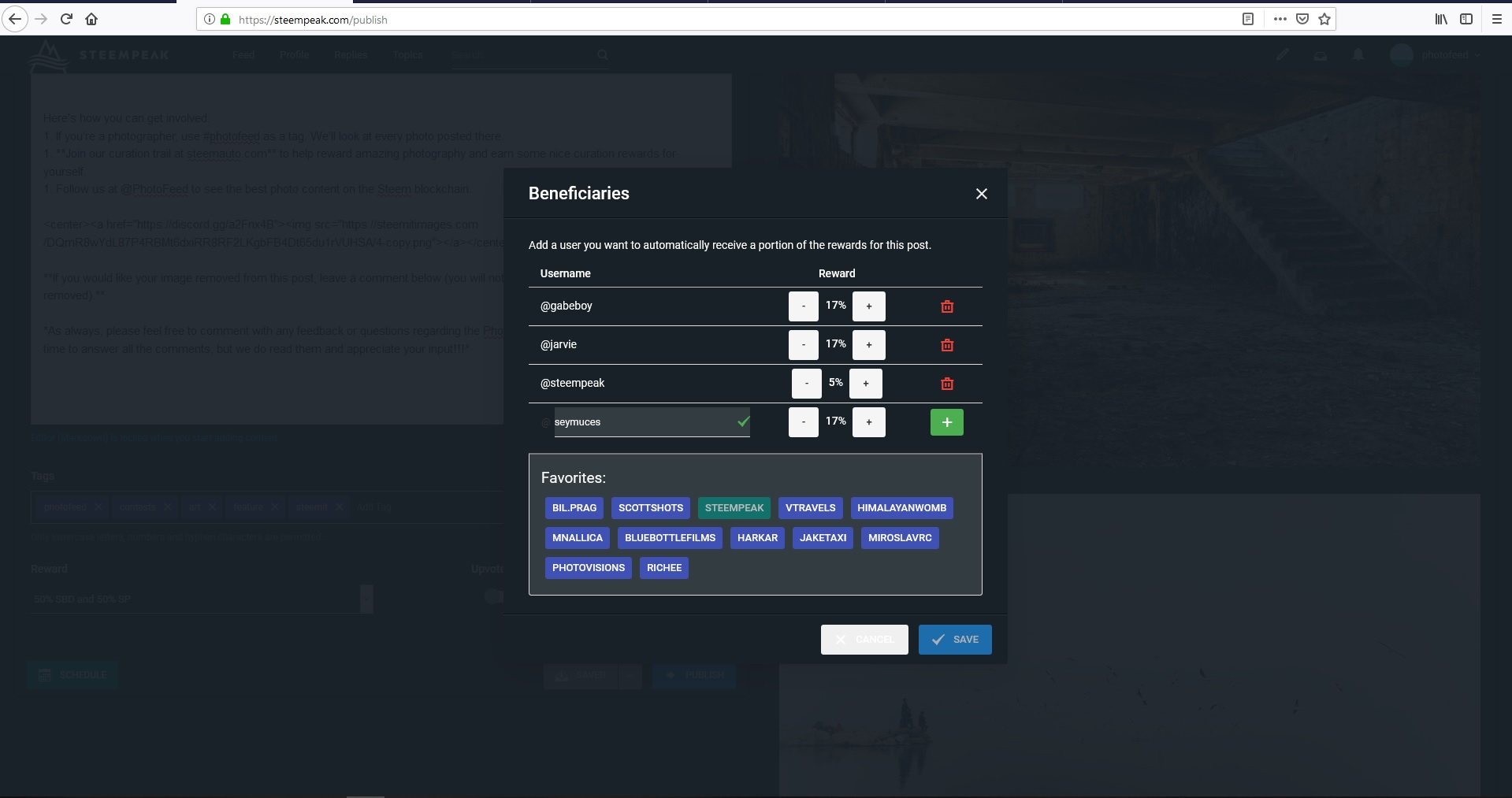 Another amazing thing about Steempeak is the addition of BENEFICIARIES. This has saved the @photofeed team tons of time paying out photographers, since now we don't have to pay artists a week later while doing equations making sure everyone is getting their fair share. It used to be a task none of us wanted to do, but now we can easily give 17 percent to each photographer featured in the daily round-up when making the post and then we are done with it. This has also come in handy for me personally (@aweber) when either borrowing camera equipment or taking a picture of a fellow steemian. Just give them a portion of the proceeds right then and there, and you're all set. That's one of my favorite additions.