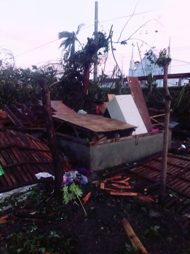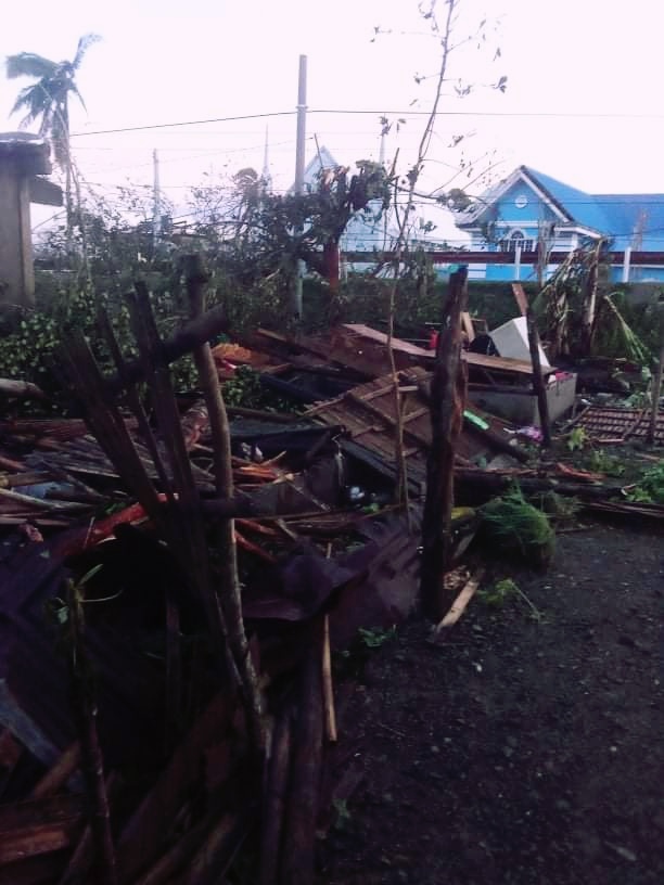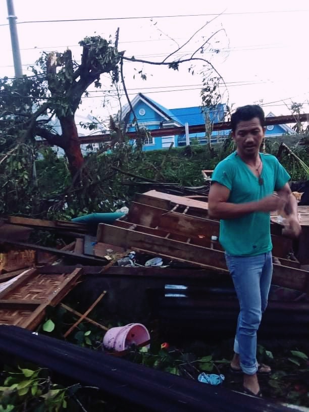 This is what happened after the typhoon: I lost my home and don't know where to begin; my brother searches for important items that we can see.