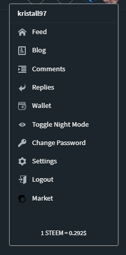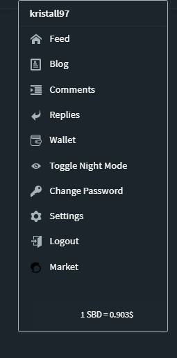 Wenn man auf die Navigationleiste unter dem Profilbild geht und dort klickt, bekommt man ganz unten in Lauftext die aktuellen Preise von STEEM & SBD angezeigt.