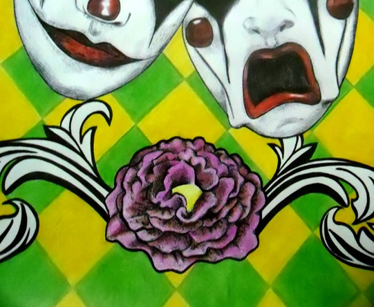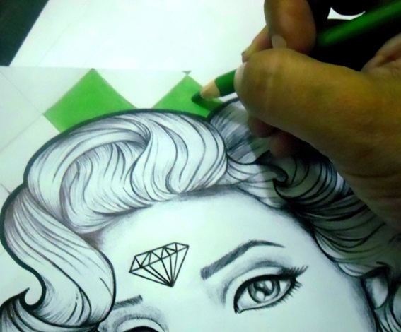 3. Faire le fond avec des crayons jaunes et verts donnant plus de vie au dessin ; Le visage avec les couleurs violet et peau ; le diamant rose pour symboliser l'estime de soi ; J'ai donné aux masques une touche sur les joues et les lèvres en rouge ; La fleur utilise des tons fuchsia et rouge. Et dans les arabesques.