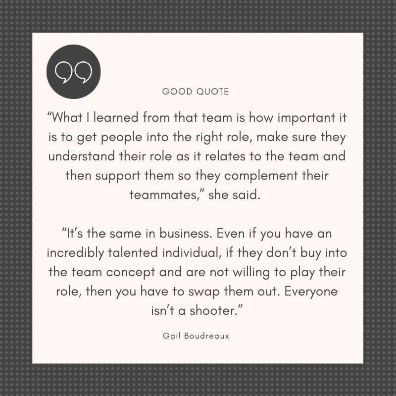 Gail learned that a critical component of leadership is teamwork.